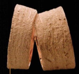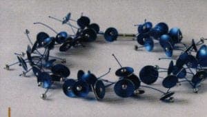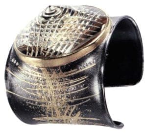 Intertwined cleverly, the individual elements of dyed parchment fit together to form feather-light arm jewelry. By Ulrike Hamm