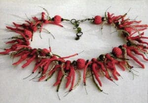 In the necklace 'Moarita' by langani, red, plastic coral arms are interspersed with embroidered pearls and mussel elements