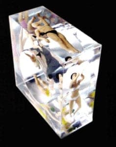 Miniature figures such as swimmers, cyclists or small farming landscapes are kept for posterity by the design duo Brune + Wöhlke in summery cast resin rings