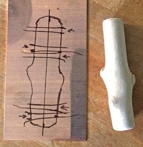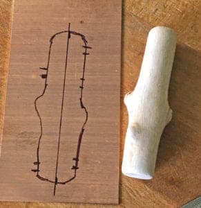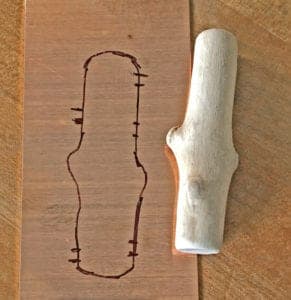 Indicate a centerline by either measuring it or eyeballing it. It does not need to be exact, just visually centered. Next, determine where the extended tabs should be positioned based on the contours of your specific object. Be careful to avoid bumps or bulges, as the tabs must be compressed tightly around the object to secure it. Make sure the tabs are at least as long as the object's radius (half the diameter). When in doubt, err on the side of longer. Indicate a second line about 2 mm outside of the object outline (not shown)—this will serve as your sawing line.