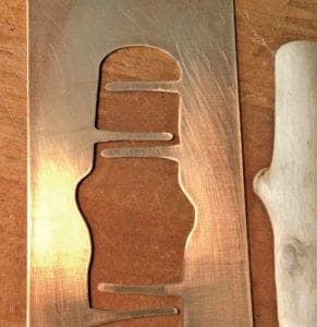 Decide on a bail shape and final frame width or shape. Add those outlines to the metal. At this point, you can either texture first and then saw (my preference), or saw first and then texture. There is no rule here, use your own judgment on the final design. I chose to use a surface texture on the metal because the soft driftwood branch I used has a very smooth and delicate surface. I textured the bronze with a chasing punch and some metal stamps. I did not texture the back of the sheet; however, this can be done as well if you choose to.