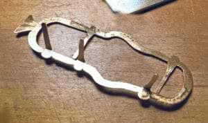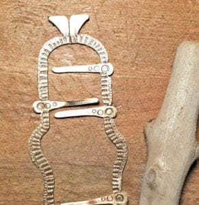 Bi-directional tabs are a decorative way to secure delicate objects that have very pronounced curves or are thick, round, or otherwise a challenge to mount securely on sheet metal. I like to create extra long decorative tabs with my saw that will encircle the object much like a strap. Once the tabs have been burnished and work hardened, any thick or barrel shaped object, such as a branch, tube, shell, pebble, or stone, can be securely mounted and appears to float within the frame. This is a good skill to have as more consumers are seeking customized jewelry that incorporates materials that hold significance to them.