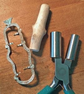 Use round forming pliers to coax the tabs into a curved shape that matches the contours of the object. The metal will begin to work harden as you form it, so take care and be decisive as you move the tabs. You can anneal if you overwork the metal, but I prefer not to, especially with softer metals.