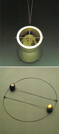 By limiting the sculptural contours of her pieces, Enterline is free to find an expressive vocabulary of placement, surface alterations, material contrasts, and kinetic potential that introduces artistic tension to what begin as elemental forms. In the "Totem Pendant" group, for example, Enterline explores trailing strings of spheres and ovoidsalmost an analog in metal to the accordion-like strands of whelk egg cases. Each "egg" becomes a serial object, and because Enterline tops each pendant with a half-shape, the artifice is obvious, however natural the shape. In effect, the artist lets the viewer in on how the hollowware structure was built, branding a seemingly "natural" form as a clearly constructed artifact.