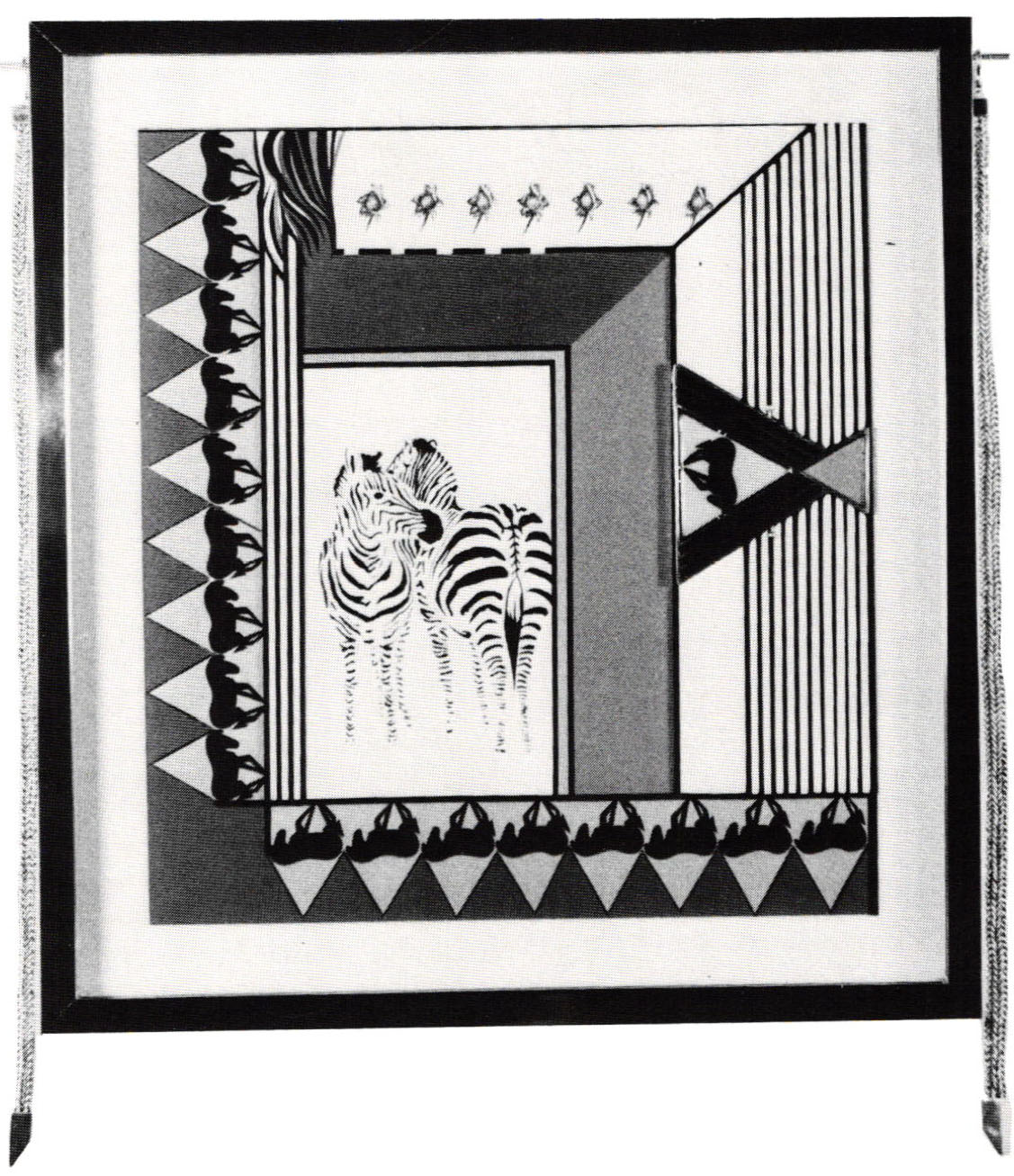 On a miniature scale, the wall pieces, all less than a square foot in dimension, were fanciful paintings in various combinations of paper, paint, wood and metal. Ranging from nearly deco patterns to fantasy worlds to personal projections, all were characterized by an attention to detail and a precision of execution. They were, of themselves, striking images; closer inspection further revealed a pleasurable combination. as each work was designed to display a carefully worked brooch, pin, earrings or other objects of adornment.