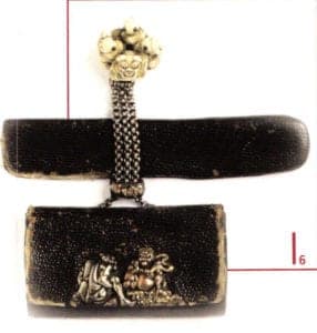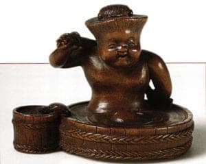 The name is derived from the Japanese words ne (root) and tsuke (to attach). This is proof that the word was originally used as the basic material. Today it is no longer possible to determine precisely when the tradition arose to attach things to a belt using a netsuke. All we have are pictures and prints on which actors and samurais wore sagemonos (suspended objects) and inro with netsuke. Over the course of time, this useful object, which was originally made of wood, mussels, horns or animal teeth started to become more elaborately designed. Netsuke can be divided into different groups. A distinction is made between the following: