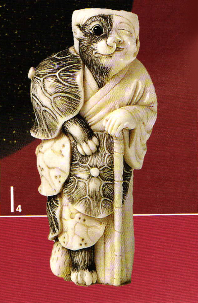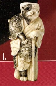 "Tanuki as a priest", ivory, one eye inlaid in horn. Mid 19th century