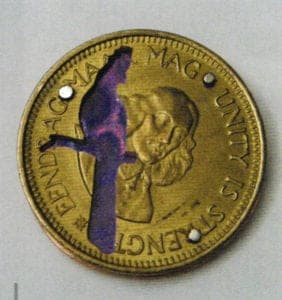 "I like to work with old coins (besides the fact that they have been handled so many different people: they have a history) they have already had images and words on them, which can be used in interesting ways." Geraldine Fenn
