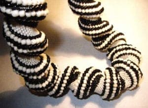 Tanja and Philippe Bousquet. A part of a collection using South African elements like ivory, animal pattern (cheetah fur) and diamonds. They use glass to reproduce the ivory effect by the lampworked glass beads techniques