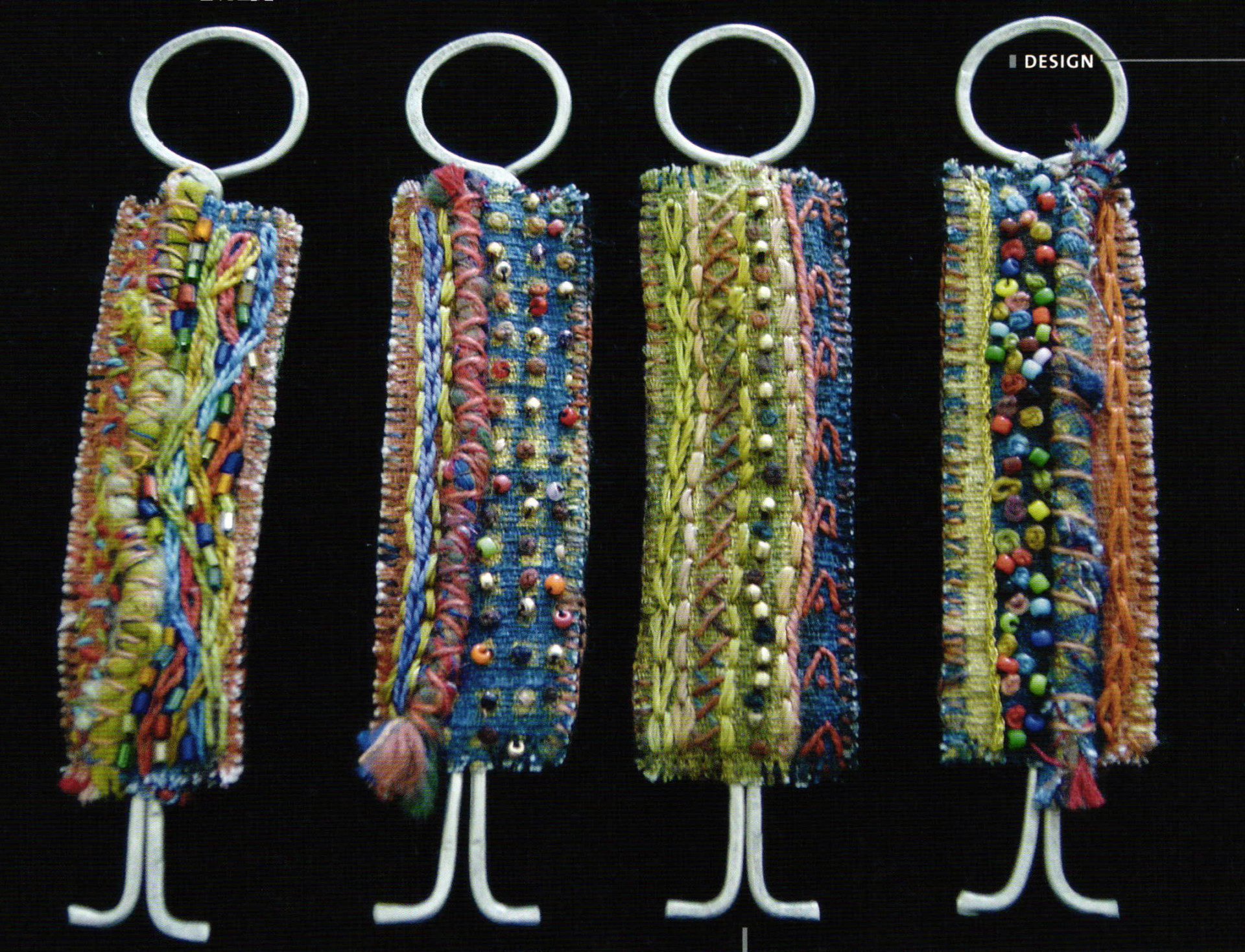 Brooches by Dana Biddle. Cotton fabric, thread, beads, wire