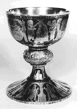 Niello is a deep black metal mixture that is fused onto metal for decorative effect. Though worked on three-dimensional objects, the effect might be considered graphic because it relies primarily on shape and pattern.