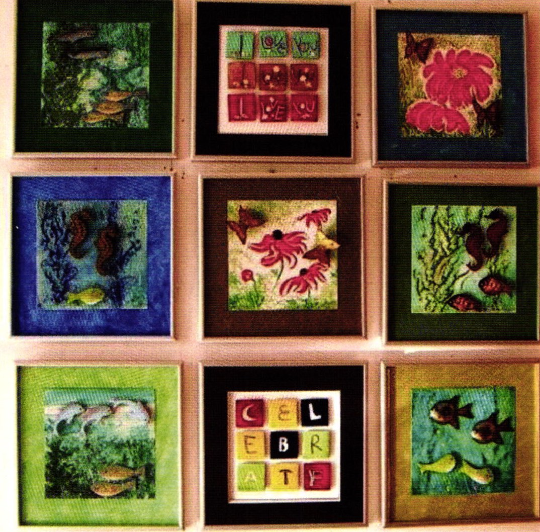 One and one half inch squares with letters composed of glass threads, wire or beads on magnets were made for the "Celebrate" piece using a plain 6 x 6 inch steel panel. The letters may be moved around to make many different words… making a game of it.