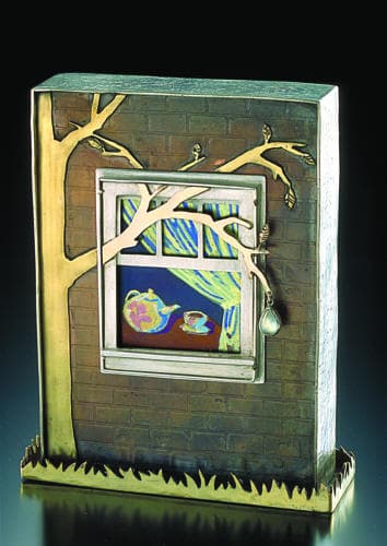 That experimentation led her to what would develop into her signature pieces — complex, detailed pins and pendants in silver and titanium, which feature landscapes and interior scenes. The pieces are inspired by drawings Yovovich did as a graduate student for her university's psychology department, which used the ambiguous scenes for psychological evaluations. "I do interior scenes where there is something going on, but you don't know what," she says. "I try to create scenes of dynamic tension, without being explicit. At art fairs, I'll listen to people saying [to their companions], 'Look, here's a picture of…' and they tell a little story. It's just amazing, the stories people tell about these pieces, and it doesn't ever occur to them that what they're seeing isn't in [the piece]."