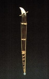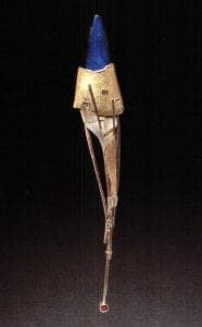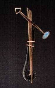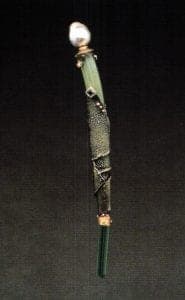 Stretched, broken, wrapped, and banded, with the sense of an interior object barely glimpsed and sometimes barely contained, the cocoon has been a source for the many pieces in the chrysalis series. He also uses highly contrasting stones and non-metal materials as details that accent the tips of tapered, arching forms, or are glimpsed behind wrapped, distressed metal. These details can express the specific qualities of a source for a piece, such as the opals used in the chameleon series to echo the color change that aids this animal's survival.