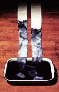 Cunningham's works are almost all tokens, gifts, intimate markers of the bodies junctures: rings that can be nervously and absent-mindedly turned around the finger; bracelets of vials, whose contents slowly seep and mix together creating an amalgam of fluids; shirts slowly stained and eventually crystallized by capillary action; and finally the rosary which elicits a ceremonial prayer of fate and faith.