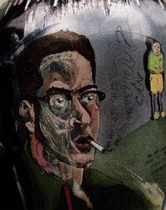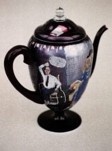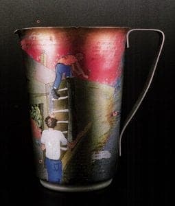 On learning how to anodize aluminum, Clifford extended his process into the realm of household objects. He purchases a second-hand aluminum article like a cup, saucepan, or a coffee container, and then anodizes an elaborate narrative scene on it. Usually, the subject matter is autobiographical. For instance, on Cough-fee, a revitalized coffee pot, Clifford depicted a narrative about the smokers in his family, and some of the rationalizations he uses to justify his own smoking habit. After he photographs the finished work, he sneaks it back onto the thrift store shelves. The object also contains a self-addressed stamped envelope, which Clifford hopes will encourage the buyer to respond with his or her opinions about the artwork. However, feedback from the marketplace has been disappointing so far.
