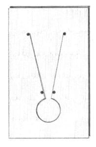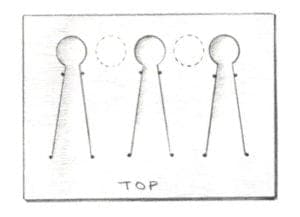When laying out a die it is important to make the hinge long enough to provide spring for the positive element. Generally this length should be between 1½ to 3", depending on the scale of the design. Hinges that are too short make the die difficult to load, but a hinge that is too long allows the die to bend, shifting the parts of the die out of alignment. For an earring of typical size, I make the hinge about 2" long and allow at least a ⅜" border around the die. I drill a pair of holes at the top of the hinge and near the perimeter of the design (Figure 2) then carefully cut the design with the proper angle and blade. When this is done I connect the holes with two freehand lines, cut with a larger blade and a conventional sawing technique. No angle is necessary for this edge because it is not a cutting surface.