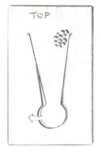 After heat treatment and cleaning, the die must be prepared before being used. The hinge area functions as a spring and must undergo its own heat treatment, which brings it to a slightly higher temper than the rest of the die. Use a torch with a relatively small flame to heat the hinge and the area adjacent to its base to a bright blue color. It is only after this step that the die can be realigned. With the die on an anvil, strike it with a slightly rounded steel hammer to stretch the steel and move the positive element, (Figure 3). It will be forced away from the location of the blows, as shown. Check the alignment by examining the gap very closely. The time you spend in perfecting this fit will result in efficient cutting and a smooth edge.