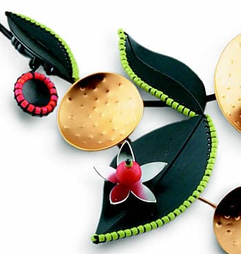 One of the more difficult challenges Chihiro Makio of 314 Studio in Jamaica Plain, Massachusetts, faced when creating her Orange Necklace was getting the citrus-themed elements to sit properly on the wearers neck. The piece comprises roughly 30 three-dimensional elements, some shaped like oranges and others like leaves, and deciding how to best get them to sit in harmony with one another took some doing.
