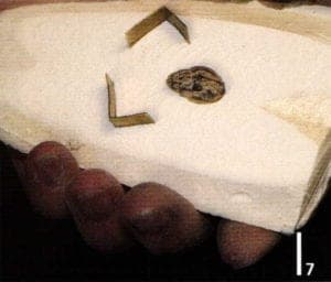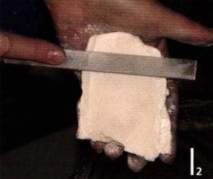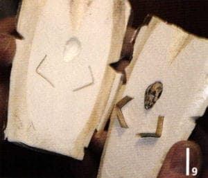 The bone mould must be well dried otherwise it will become brittle or porous. It is then cut in the middle (1). The soft inner sides of both halves of the mould are then filed down flat using a coarse file or sandpaper (2). The two halves must fit together well to create a clean cast with a seam as small as possible (3). The object from which the cast will be taken is gently pushed into the flat inner side of one half (4). The object is then pushed half-way into the mould (5). Two small brass plates are used as brackets (6). They are also pressed into the mould to ensure that the two sides of the mould fit perfectly (7). The two halves are pressed together so that the model and brass plates are completely molded together. Notches are then cut into the side of the moulds. The curvature of the moulds is sawn down to ensure a secure base during casting (8). Both halves are then released from one another and the casting model is removed (9).