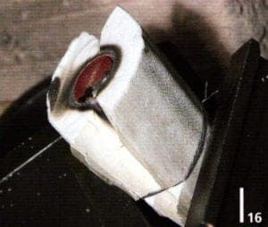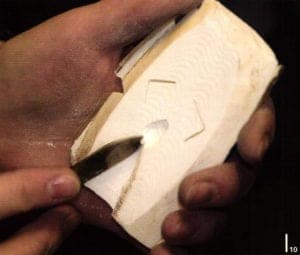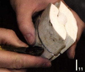 A funnel-shaped casting channel is carefully cut into the two sides of the mould using a knife (10). They are then secured using binding wire. This is wound round the moulds at the level of the notches to prevent the two halves from slipping (11).