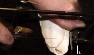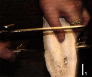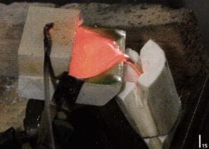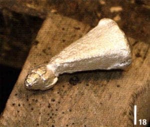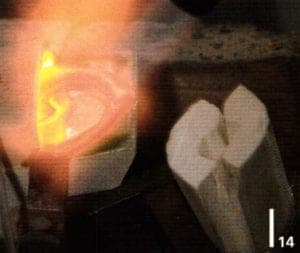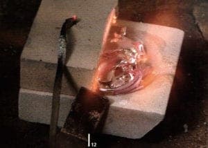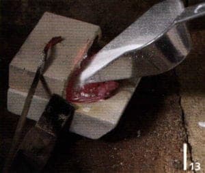 The melting pot containing the fluid alloy must be brought closer to the moulds without oxygen entering and cooling the alloy. The flame must therefore be kept directly above the liquid material (14). The alloy must then be poured quickly into the mould (15). As soon as the alloy has cooled down, the binding wires can be cut (16). The fibers of the bone and the different rates of burning are evident from the burnt-out section (17). The casting channel must then be cut away from the cast object which can be neatened up if required (18).