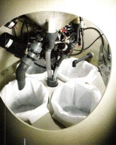 The method employed in the MF series by OTEC cleans the wastewater in a significantly more concentrated form. After the grinding and polishing process, the water flows out of the grinding system into the filter chamber of the micro-filtration system. The innovative filter concept removes the entire solid residue from the wastewater and captures the sludge concentrate in replaceable containers. The filter unit in the MF series filters particles out of the wastewater, if they are larger than 0.2 micrometers. The water and compound mixture, which is cleaned in this way, is fed into a clean water tank, and purified water is pumped back into the grinding system. This circuit means that the water can be used for several weeks. The sludge that collects can be removed at any time from the exchangeable containers.
