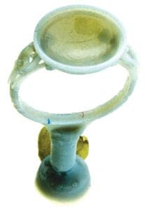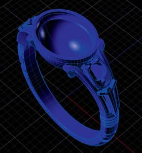 Keim modeled the ring in CAD to these specifications, using a red glass center stone to match the original, as well as white topaz for the accent stones. After printing the CAD file on a Solidscape T66 3-D printer, the production team at RW decided to use the HD Pattern System to mold and shoot patterns of the ring for casting as opposed to using a traditional wax injection process. "With a very slight design like this one that goes from a very thin shank to a substantial bezel, we have had problems in the past getting regular injection wax to fill the molds," says Holthoff. In this example, the 1.65 mm wide by 0.98 mm thick shank meets up with a 12 mm by 13 mm bezel, with some filigree work in between. "Also, standard injection wax doesn't tend to hold the firm, crisp details in a thinner piece such as this one as well as the HD material does. HD allows us to keep the shape and integrity of the pattern for casting."