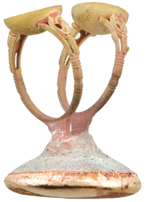 The second potential problem arose during soldering. Sider cast the bead in sterling silver in two pieces. After soldering the two halves together, he became concerned that the holes for the cord on each side might make the bead weak. He found a solution for this soft metal: "Kitty made the two halves fit so well that it was easy to weld them together in wax and cast the bead as one unit," he says. "They cast just as well as one form, and they're less costly than to silver solder each piece." However, having the model in two parts enables Sider to easily execute a bi-metal version of the bead.