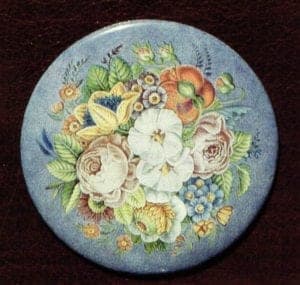 His work evolves from an idea to drawing, creating more and more drawings until he produces a "perfect, fine design." This is transferred to a sheet of tracing paper in original size. As to a color palette, "I never make a color study for an enamel painting. The colors and effects are in my head." The original drawing is transferred with graphite paper to a copper plate, which has been prepared with three coats of opaque white as a base. and three coats of counter enamel. He then begins to paint, using lavender oil. sandalwood oil and heavy turpentine as a painting medium, thinning with clear turpentine. A coat is painted then dried, one color at a time. Each painting has a minimum of three coats or more. His miniature painting are always drawn first; only his cloisonné work ever contains spontaneous effects.