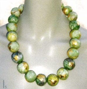 Thanks to its lightness, paper has the advantage that women wearing jewelry made from this material will barely notice a thing, even if its format is rather large. There are absolutely no limits to the richness of color; accordingly, fantasy can be boundless, emphasizes Marion Gunther, who also focuses intensely on paper jewelry. Her paper pearls are rolled individually and then fixed using the various glue mixtures, depending on the desired effect. After this, the paper pearls are formed and processed on the litho stone using the folding tool. The high-quality, long-fiber and mostly hand-dipped papers are made resilient after drying by grinding and waxing.