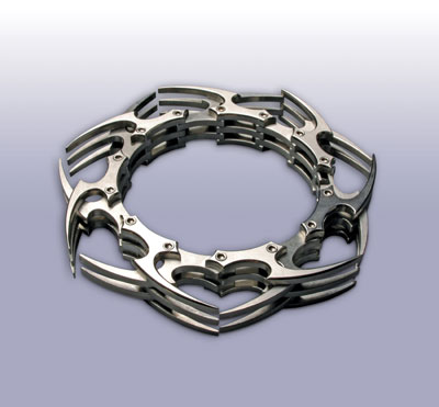 The shapes of the links were inspired by Pruitt's background in the body piercing and tattoo industry. "I wanted to create something that looks pretty tame when it's lying there, but the minute you pick it up the spikes start flaring all over the place."