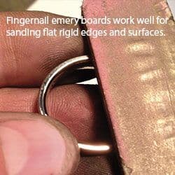Sanding sticks, including fingernail emery boards, work well for flat rigid edges and surfaces. Handheld sandpaper, or sandpaper wrapped around any surface that matches the metal's contour, can be used. I have even wrapped sandpaper around a coffee mug for large soft curves. Lap wheels and solid felt buffs work perfectly for flat surfaces, as well as on the sides of rings.