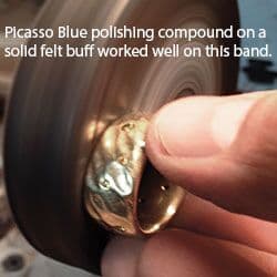 The final polish is actually a series of steps that should make full use of the many polishing compounds that are currently available. For many years, most jewelers started with tripoli and bobbing compound, which were used first in the polishing process as cutting compounds to remove any remaining scratches, followed by red rouge for the final polish. Today there are many options designed for specific metals and desired finishes. One of my current favorites from Japan is called Picasso Blue, which is formulated for platinum, though it works beautifully on white golds and palladium as a final polish. Try what's available to see what you prefer.