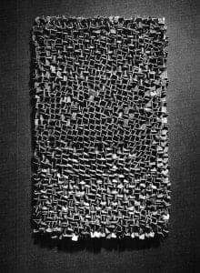As was her custom, Vigeland wished to do something untried and unique for a solo exhibition, planned for 1989, at the Kunstnerforbundet. The richly appliquéed silver mesh was abandoned in favor of flat or layered constructions composed of contiguous or overlapping silver squares or rectangles, affixed to each other by tiny, invisible rings. The overall effect may suggest a tiled floor, a shingled roof, or possibly the protective shell of an armadillo. And although Vigeland was to briefly back away from this direction, she would ultimately return to it, albeit in a different format; and it furthermore becomes apparent that these geometric works suggested to her the meshless pieces from 1991 and 1992.