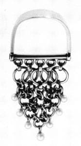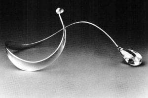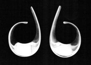 While attending the Oslo Yrkeskole, Vigeland made a pair of screwless silver earrings, based upon earlier experiments in copper and pewter, and inspired by a summer visit to Denmark in 1953 when she was fifteen years of age. At that time, the gracefully undulant jewelry by Henning Koppel figured prominently in the repertory of the venerable Danish firm of Georg Jensen. And the curvaceous necklaces and bracelets by Swedish jeweler Torun Bülow-Hübe (who was to design for Georg Jensen, also, beginning in 1967) had already been exhibited in Norway in 1951. These earrings, by Vigeland, entitled Sling, resemble an open numeral 6; the long top-tail nestles behind the ear while the lower scroll curves inward to hook into the lobe, a brilliant design which eliminates the need for the clumsy appendages usually necessary for wear. Per Tannum, manager of Norway Designs, saw the earrings at a student exhibition and invited Vigeland to apprentice at Plus, an arts and crafts center in Fredrikstad which he founded in 1958, with the purpose of commissioning artists to create original designs for industrial production; needless to say, unpretentious prototypes in silver, clay, fiber, etceteras were meant to elevate commercial standards through aesthetic and technical excellence.