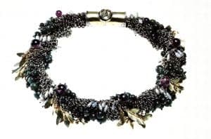 Vigeland began this journey of discovery by connecting small silver rings to create various types of mesh which recalled both chain mail and lace work. The first pieces made by this technique were large collar-like necklaces of oxidized silver, in which the mesh was given varied structures and colors. Gradually, the surface became more complex, richer, and diversified in both texture and hue. This was achieved by concealing the web-like background, in part, behind anchored elements of silver, gold, enamel, and stones.