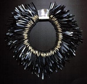 The first in a series of important one-person exhibitions at the Kunstnerforbundet (Artists' Association) in Oslo occurred in 1978. Emboldened by continued national recognition, in 1979 Vigeland showed her work to Barbara Cartlidge, whose Electrum gallery in London specialized in jewelry by an international array of prominent artists. Cartlidge gave Vigeland a solo exhibition in 1981. Desiring to create something totally new for this show, Vigeland began playing with hand-forged nails, from an Empire-style house, which a friend had given to her. She had always been enamored of found objects and proceeded to test the boundaries of these nails; she cleaned, hammered, stretched, bent, gold-inlayed, and polished them. This led her to experiment with other types of tacks, especially the blue-black steel sorts, which when forged acquire a distinctive sheen and flat feather-like shapes. The necklaces assembled with these nails, redolent of Brazilian natural feather collars, also serve to illustrate Vigeland's fascination with a kind of romantic primitivism, consistent with much jewelry done in the 1970s. One need only view jewelry from this period by Arline Fisch, Mary Lee Hu, and Robert Lee Morris, to name a few, to recognize the impact of this tribal sensibility.