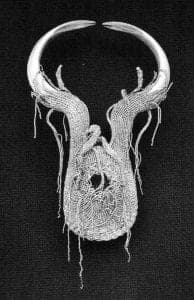 Simultaneously, in the United States, however, a like-minded contingent of jewelers were actively engaged in methods which were sympathetic to Vigeland's mode. Arline Fisch and Mary Lee Hu, for example, were exploring the application of textile techniques to metal wire. Still, neither knitting, crocheting, plaiting, nor braiding afforded the structural mobility which Vigeland required. Therefore, in 1973, she embarked upon her first significant experiments into the nature of flexibility: pliable bracelets and necklaces constructed from silver hemispheres threaded on a chain. These endeavors led to larger pieces, assembled from chains of small tubular silver bits, varied occasionally by the addition of enamel, stones, gold, and gold and silver in combination. Vigeland also returned attentively to studying the intricate wire joinery practiced by East Indian jewelers, a technique she alluded to previously, in 1967.