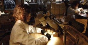 The Cartier engraver always applies his delicate filigree work to the movement components under the microscope