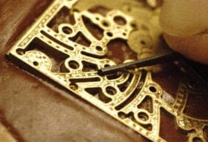 The Cartier engraver then 'paints' his delicate pattern onto the skeleton component with a miniature graver