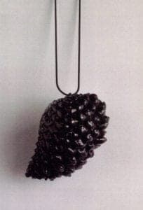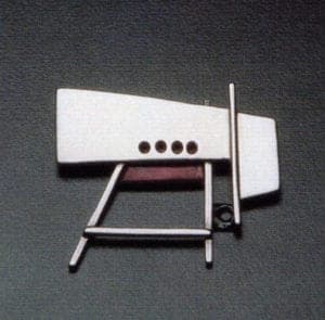 It is impossible to discuss this inevitable shift without discussing the advent of Postmodernism and how it first characterized itself in American jewelry in the early to mid-eighties. The evidence of Postmodern thought in jewelry initially presented itself in two ways. First through the so-called new jewelry, which emphasized material and form exploration, particularly in ways that challenged ideas of value and taste. The new jewelry also explored the parameters of jewelry's relation to the body, questioning traditional locations and manners of wearing jewelry. While jewelry's relation to the body was considered and investigated, the questions were primarily formalist or historicist. The second characterizing quality of Postmodern activity was that it was simply a stylistic movement that had historical markers and borrowed from principles of architecture and design. First initiated by the architects Robert Venturi and Charles Moore, who were influenced by the writings of Jacques Derrida and Roland Barthes, postmodern buildings showed a wry mixture of romance and irony. They challenged the fixed and purist identity they felt was plaguing architecture. Their changes to the principles of the practice produced an image of Postmodernism which was immediately codified. Most important was the movement's return to historical models, which is most recognizable in the work of architect Michael Graves, who had a significant impact on many jewelers' style of working. The influence of Graves and the designers Ettore Sottsass and Phillipe Stark on jewelry was for the most part, short-lived and very quickly subverted by commercialization. The role and trustablility of history was not brought to question in jewelry, it was simply being made officially available again. What is most obvious about these two activities and the changes in jewelry's direction is that they primarily represented a change in form. They did not produce nor clearly intend any perceivable change in the social function of jewelry nor did they challenge ideas of jewelry's behavior or significance. This was due in part to the Postmodern style's lack of coherent objectives.