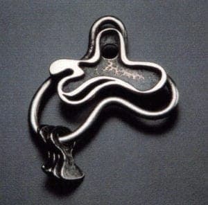 When we look at the works of artist jewelers like Art Smith, Margaret De Patta, or Sam Kramer we see evidence of a time following the 1930s (the years in which these artists grew up) and its expectations of revolution and reform. The chaotic undoing resulting from the depression seeded a Marxist and socialist ideal which was gaining ground and offering hope, only to lead to consequences that were humanly questionable and emotionally frustrating. The disillusionment brought about by war and the internal conflicts of social responsibility made all values dubious for artists of the time. By the early 1940s frustration and despair gave way to a need for catharsis that found its voice in the models of abstract expressionism and surrealism. Abstraction reaffirmed the idea of a new humanism, which rose again with promises of a universal language in art, where art takes a natural place along side other human activities. For activist, poet André Breton Surrealism was a defiant practice that refused to submit to rational process; oppositional methods of making were adopted as a revolutionary strategy. Breton, living in New York by the late 1930s, was writing essays on various artists' work who were showing at the Julien Levy Gallery, where numerous Surrealist exhibitions were mounted, including the work of Man Ray and Miro. There is no doubt that many of the jewelers represented in Messengers of Modernism were kindred spirits of this generation of artists' and they were sympathetic to the styles and principles of abstraction an surrealism. But, by the mid forties another bred of jewelers and silversmiths were initiating programs at universities across the country. Their training and profession as designers or designer/craftsman in the English and Scandinavian functionalist tradition grew philosophically out of architectural principles rather than from studio art Practice. A number of the jewelers in Messengers, such as Paul Lobel, Carlton Ball, and Harry Bertoia, crossed both paths. The overriding aspiration gleaned from this model was the idea of a progression to universality. As corrupt and traditional narratives and allegories were removed from the face of art jewelry, along with the useless and excessive vulgarity of ornamentation, what was left and consequently held shared meaning was form.