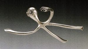 Phillip Fike earned his Master of Science degree in 1951 from the University of Wisconsin. His graduate show included niello work, engraving, fine wire work, and carved and inlaid ebony brooches, pendants, and small sterling silver castings. One abstract sculpture Swimmer depicted a begoggled figure, limbs akimbo, joyously navigating underwater. To achieve this pose with limited casting facilities he cast it in six parts and brazed it together.