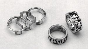 By the mid 1960s Fike was also combining his interest in interlocking ring sets, wide pierced wedding bands, and juxtaposing multiple colors of gold. For this he devised a bi-metal casting process using 14k white, yellow, red, and 24k gold. He realized that by not brazing the metals together after they were cast, he could preserve the visually crisp edges of the castings, thus arriving at his unique Interlocking Wedding Bands. Made on commission, they ranged from geometric to organic reflecting the personality of the individual client. Each ring was made of two, three, and even four pieces that separated then locked back in place, in only one way, to create a Gimmal or Puzzle Ring. Through these pieces Fike again revealed his genius for solving both aesthetic and technical issues with highly satisfying mechanical innovations.