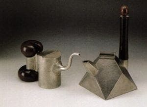 Fike liked pairing his Maiden, a pewter and granadilla wood teapot with Knight, his pewter, ebony, and gold teapot/pitcher so they could converse and create a charged atmosphere by association. The Knight is angular and erect, his Maiden is sinuous, bulbous, and suggestive. Fike shaped and carved these unabashedly male and female forms in hard wood and then married them to his metal work. He obviously enjoyed shaping wood as much as he did metal. His repeated practice of precisely stacking, inlaying, and laminating wood and metal in striped, tiled, diamond, and spinal cord type formations is the approach of a (wood) lapidarist. He considered himself a structuralist, allowing the form and the surface of a piece to reflect the process used in its making.