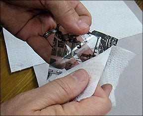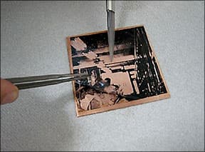 Immediately place the metal film-side up on the already-warmed paper towel on the heated griddle. Immediately place another paper towel over your piece and the iron on top of that. Let the iron sit for about one minute. Carefully iron the piece for about 20 seconds and then lift the iron. Remove the top paper towel. Hold your burnisher in one hand and your tweezers in the other. Carefully lift one corner of the film with the tweezers and see if the image has transferred to the metal. If it hasn't, replace the film and keep heating between the paper towels. Sometimes using the burnisher will help. If it has transferred, remove the film (WHILE HOT) in one smooth stroke.