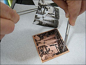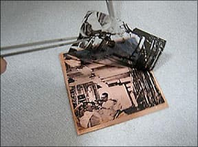 When you first try this process, use a single image of film on each piece. Later you can experiment with multiple images. If the metal cools too much, the image will come off with the film. You can, however, do multiple images in stages.