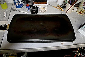 Dilution for crystals is 1 part crystals to 3 parts distilled water. After donning your safety glasses and rubber gloves pour the Ferric Nitrate or Ferric Chloride into the tub - about 1/3 full. Try not to create bubbles. A few are okay. This should be performed in a well-ventilated area. Outside would be great but in a kitchen or work room with an open window will suffice.