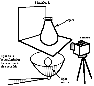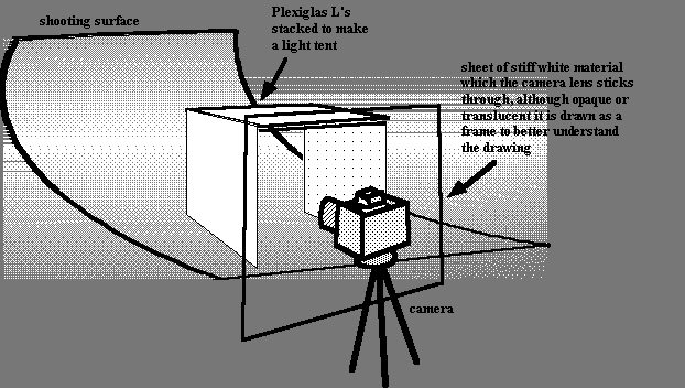 Another inexpensive approach for obtaining a tent is a trick using a translucent gallon (4 liter) plastic milk jug from the supermarket. Take a milk jug and cut a hole in it at the neck to receive the camera. Then cut the bottom off. Arrange the height for the correct focal distance from the lens to where you cut the bottom off, which means perhaps you have several milk jugs cut to different heights for different sizes of object. The lights are placed fairly close to the jug, or you can use daylight film and put your reflective object inside the jug outdoors to photograph it.